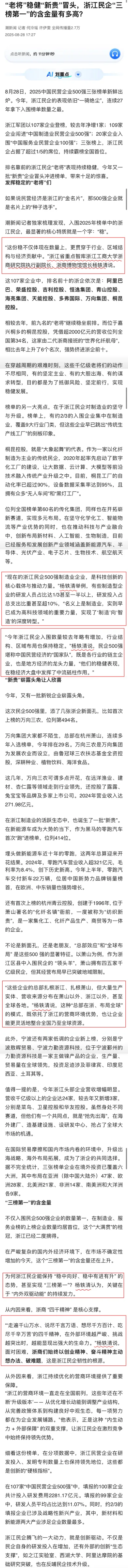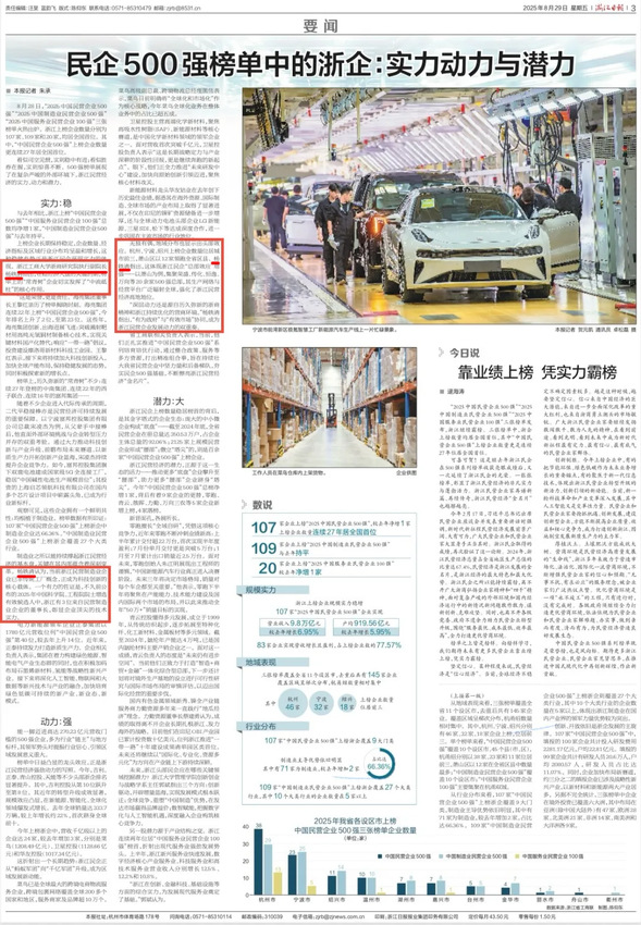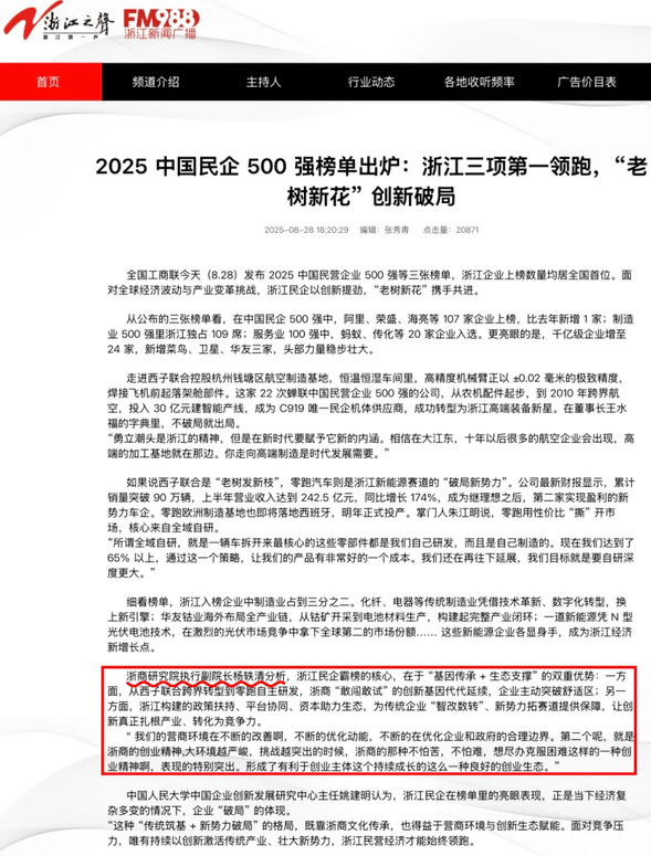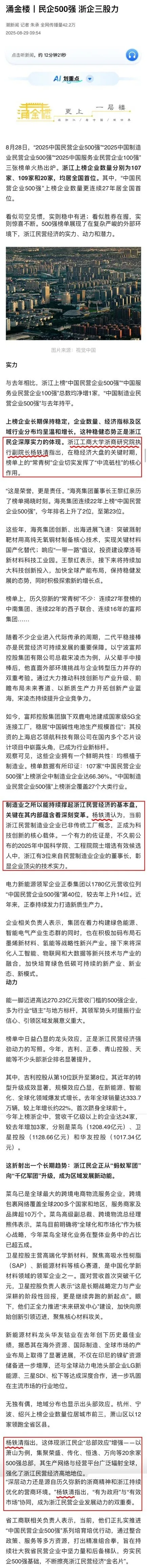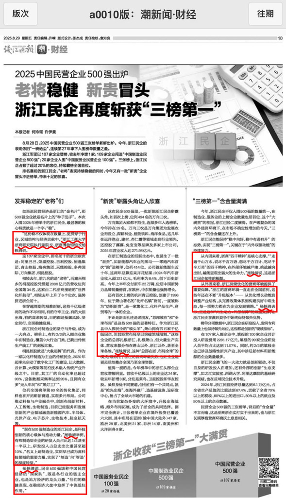 8月28日,“2025中国民营企业500强”“2025中国制造业民营企业500强”“2025中国服务业民营企业100强”三张榜单火热出炉。浙江上榜企业数量分别为107家、109家和20家,均居全国第一。其中,“中国民营企业500强”上榜企业数量已是27年蝉联全国首位。浙商研究院执行副院长杨轶清先后接受浙江卫视浙江新闻联播、浙江之声浙广早新闻、浙江日报、钱江晚报等多家媒体采访,对浙商企业的亮眼表现进行专家解读和评论。