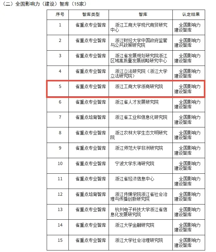近日,浙江省哲学社会科学工作办公室发布《关于公布 2024 年度全国影响力建设(培育)智库遴选结果的通知》(浙社科办〔2025〕48 号),浙江工商大学浙商研究院凭借深厚的研究积累、卓越的咨政服务能力与广泛的社会影响力,成功入选2024 年度“全国影响力(建设)智库”,位列15 家入选单位前茅。