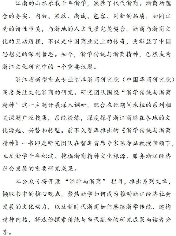 然而,在肯定当代浙江发展的同时,我们也应深入思考其与传统浙学之间的内在联系。当代浙江发展所蕴含的文化及其内在精神是什么?这种文化是如何从传统中汲取养分并创新发展的?它又将如何在新时代背景下继续发扬光大?