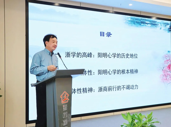 浙江省政府咨询委员、浙商研究院院长、首席专家陈寿灿教授以《阳明心学与浙商精神》为题,为新质浙商传习营开讲,助力学员筑牢文化根脉,强化文化自信,提升格局境界。他指出,阳明心学是浙学的标志,更是中国传统文化的原创性高峰,其“知行合一”“致良知” 的智慧,与浙商 “义利并举、务实创新” 的文化基因高度契合。