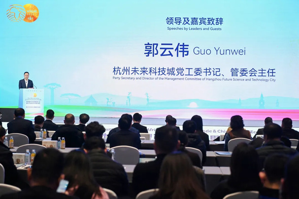 杭州未来科技城党工委书记、管委会主任郭云伟在欢迎词中介绍了余杭区经济实力,(前三季度 GDP 、财政总收入均居全省第一),及超300家企业与非洲有经贸往来,承诺未来科技城将提供“阳光雨露”式服务支持中非企业投资兴业。